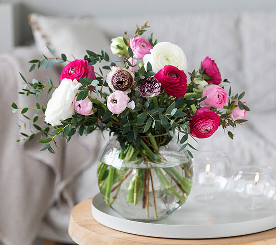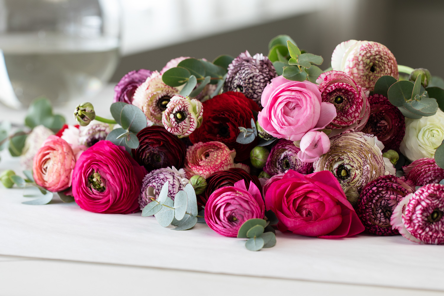 Bouquet de Renoncules composé de 12 tiges aux tonalités pastel délicatement agrémentés d’Eucalyptus.